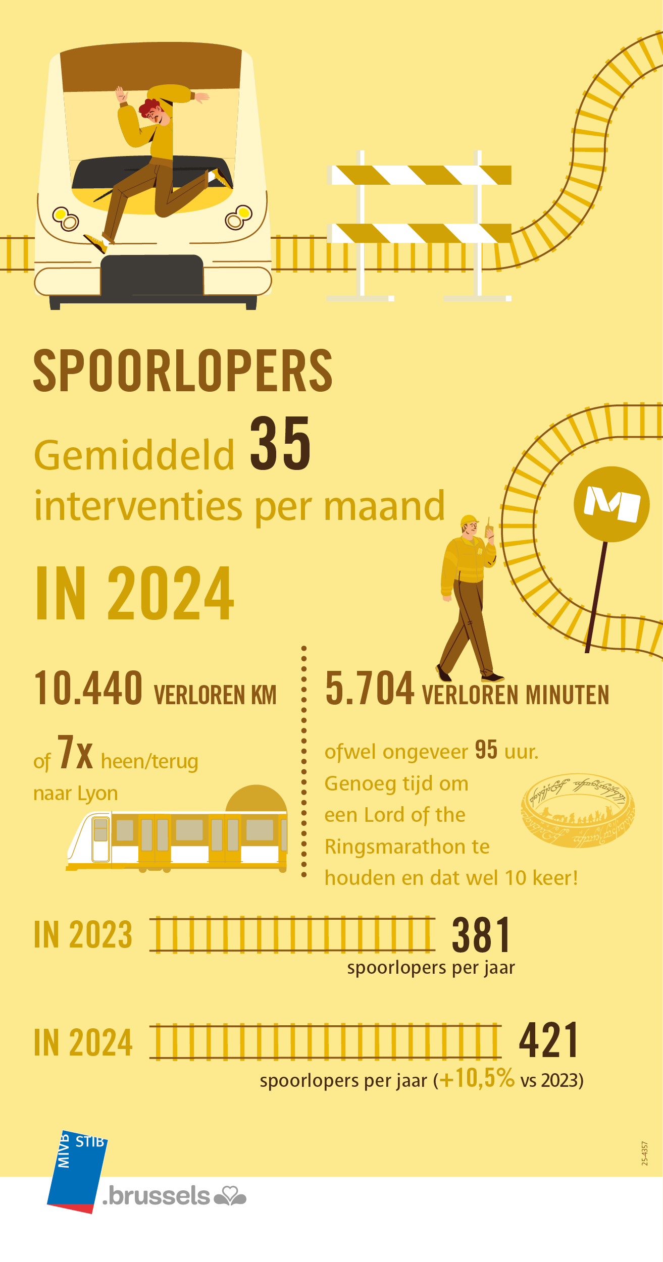 De Brusselse vervoersmaatschappij stelt een toename vast van het aantal overtreders op de metrosporen tussen 2023 en 2024. Van 381 in 2023 steeg dit cijfer tot 421 in 2024, een toename van 10,5%. Deze stijgende trend zet zich helaas jaar na jaar voort, met 43% meer spoorlopers ten opzichte van 2021. In 2025 bedroeg het aantal inbreuken eind september al bijna 280, hoewel het jaar nog niet is afgelopen.