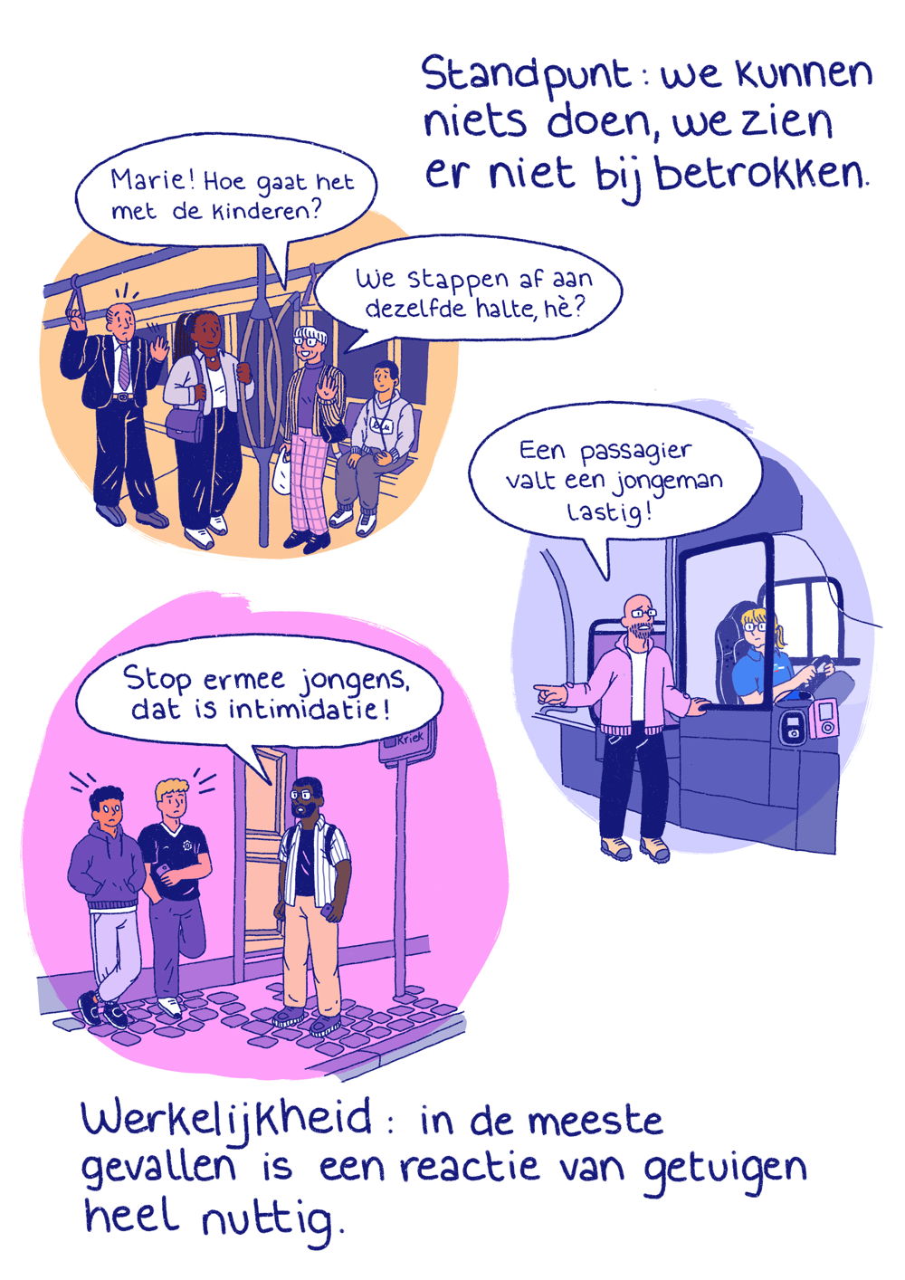 Het MIVB-personeel – van veiligheidsmedewerkers tot chauffeurs, verkopers en multimodale agenten – staat dagelijks in contact met reizigers. Het is dus essentieel dat zij weten hoe te reageren wanneer een slachtoffer of getuige van intimidatie zich tot hen richt.