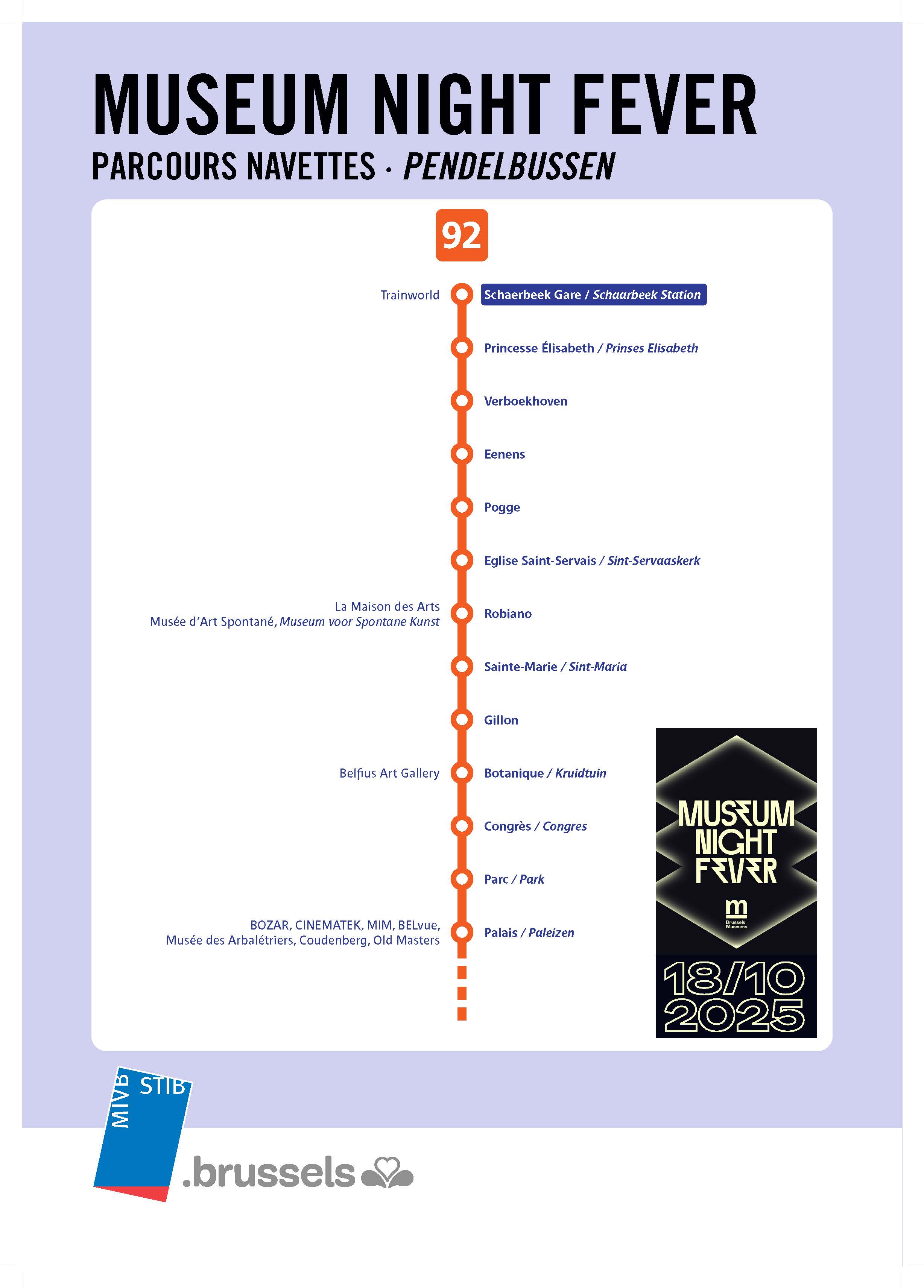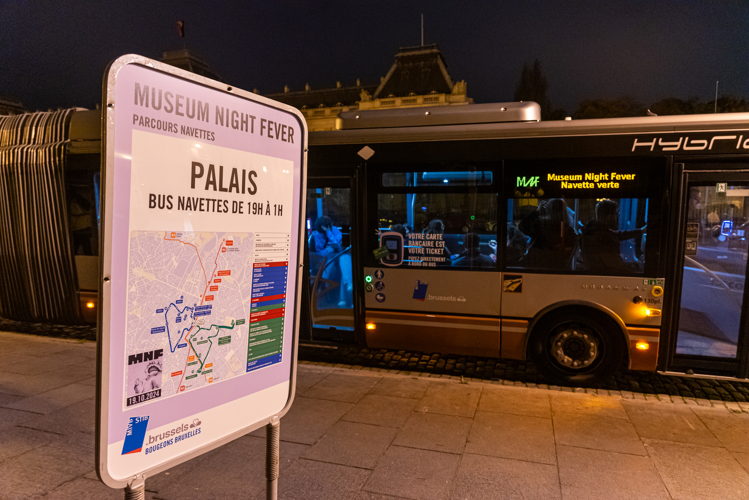 De MNF-deelnemers kunnen ook gratis tram 92 nemen, die verschillende musea aandoet op zijn parcours tussen Schaarbeek Station en Paleis, via Kruidtuin. Voor dit event rijden de trams om het kwartier tot 1 uur ’s nachts.