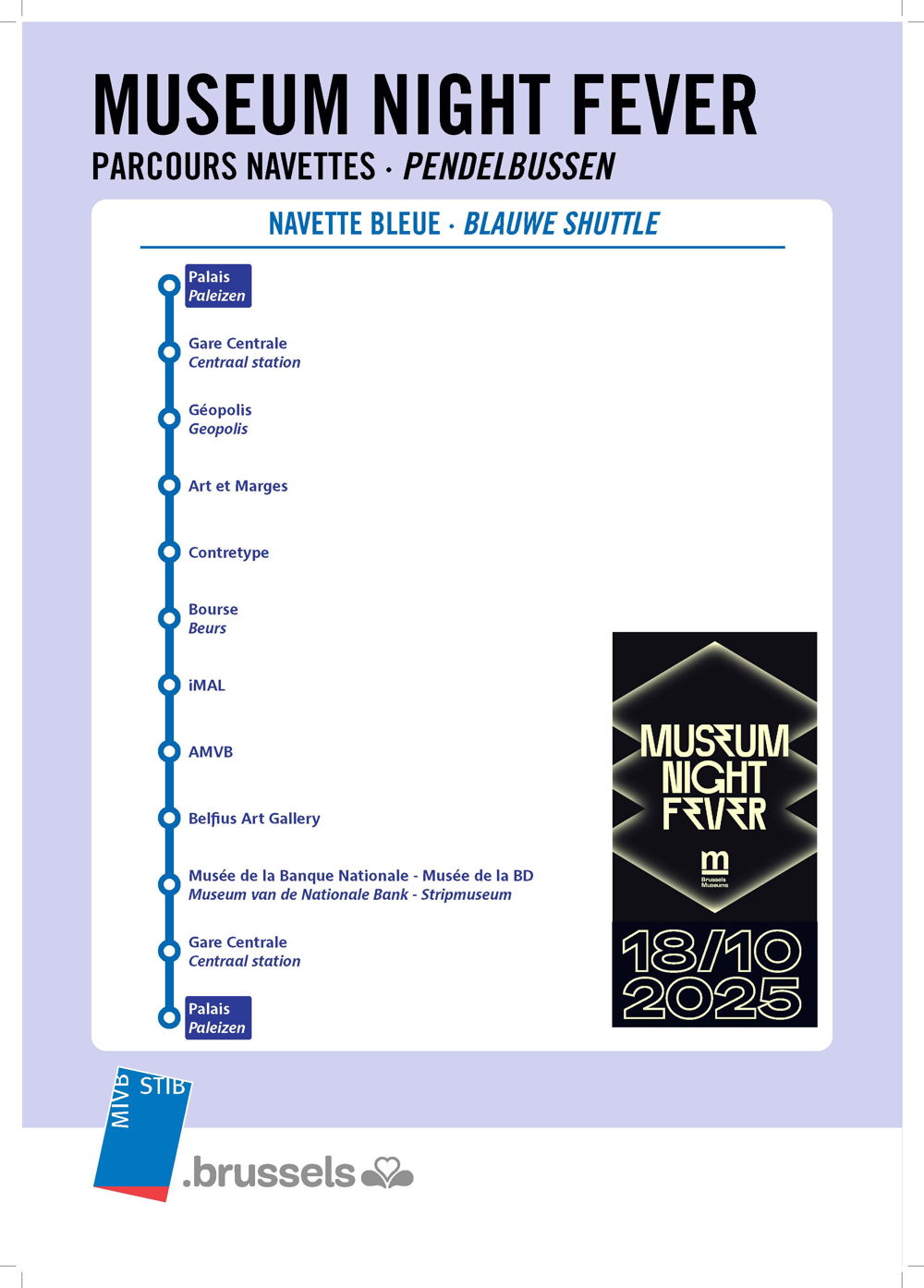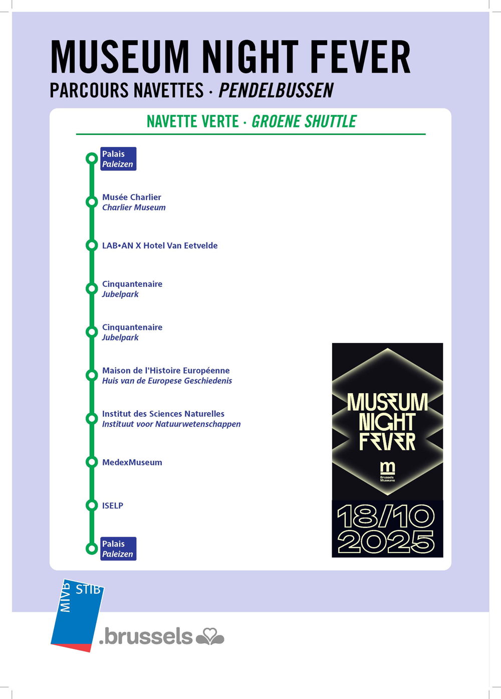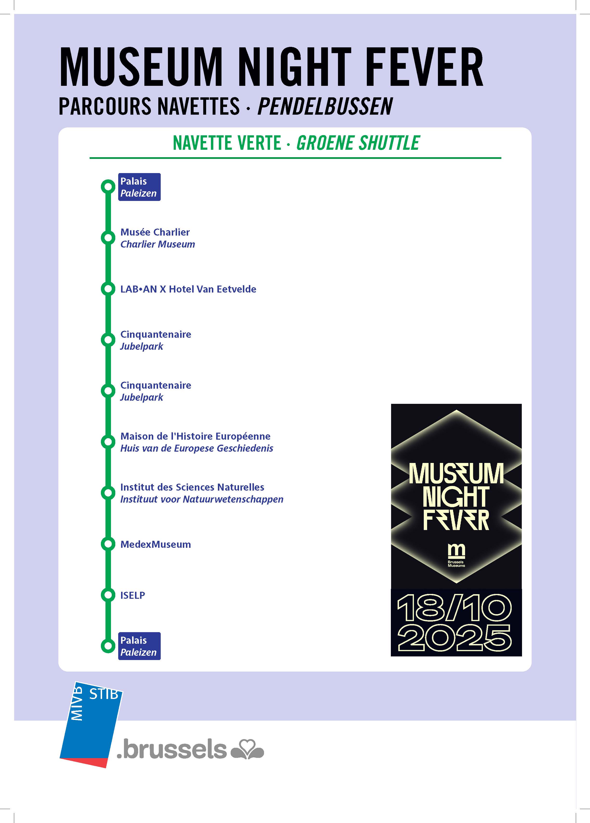 Onze hoofdstad is in de nacht van 18 op 19 oktober helemaal in de ban van Museum Night Fever. Ter gelegenheid daarvan zet de MIVB twee pendelbusdiensten in, zodat de cultuurliefhebbers zich vlot van de ene locatie naar de andere kunnen verplaatsen. Ook tram 92 en de Noctis-bussen staan voor hen ter beschikking.