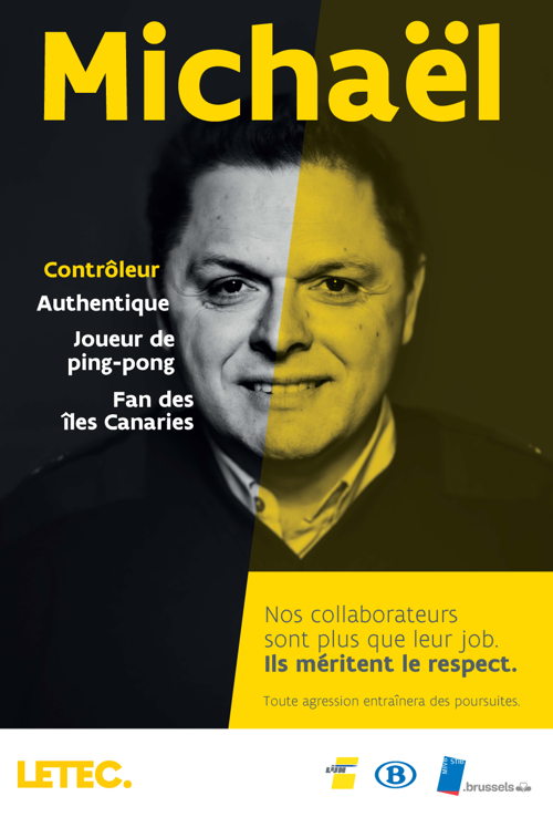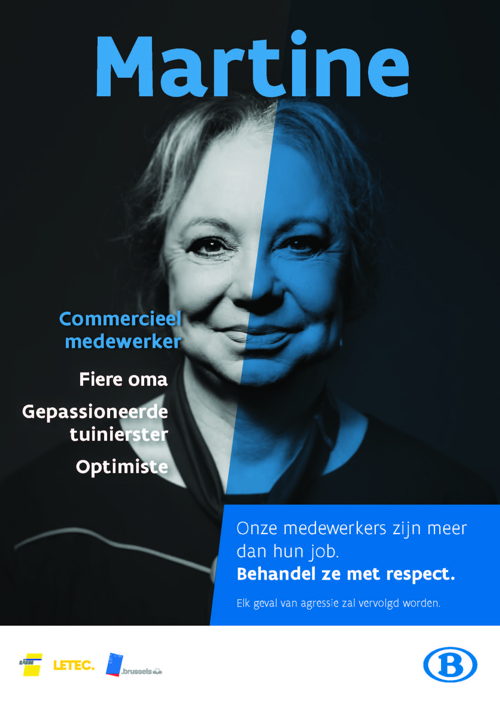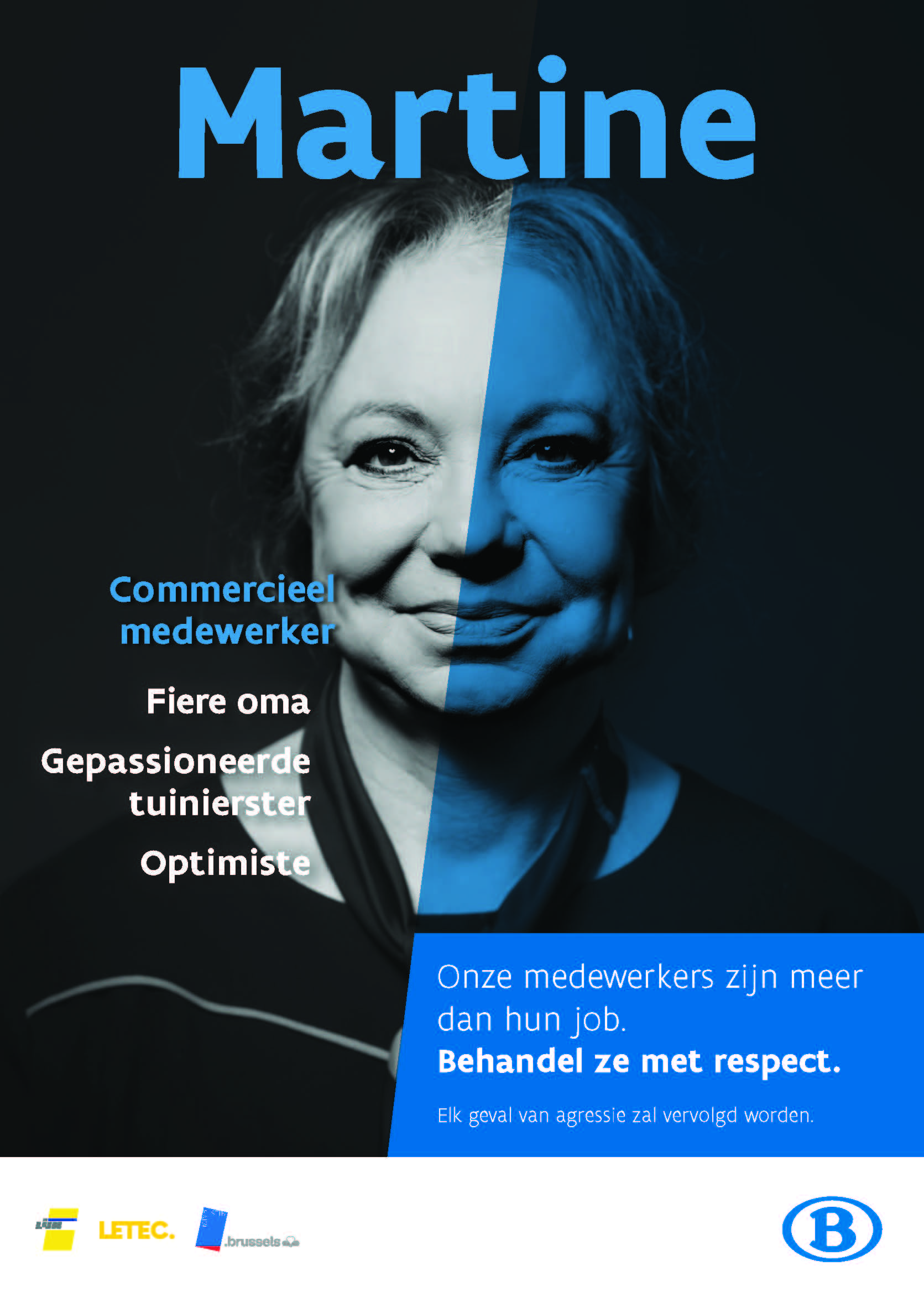 De campagne, gelanceerd naar aanleiding van de internationale dag van de tolerantie op 16 november, toont twaalf medewerkers van de vier vervoersbedrijven die getuigen over (de impact van) agressies in het kader van hun functie. Ze belicht de gezichten achter deze cijfers. Want buiten hun werk zijn deze mensen ook ouder, grootouder, broer of zus, beste vriend(in) van iemand, zwemleraar of voetbalcoach. En het respect dat ze hiervoor krijgen, verdienen ze ook in hun werk.