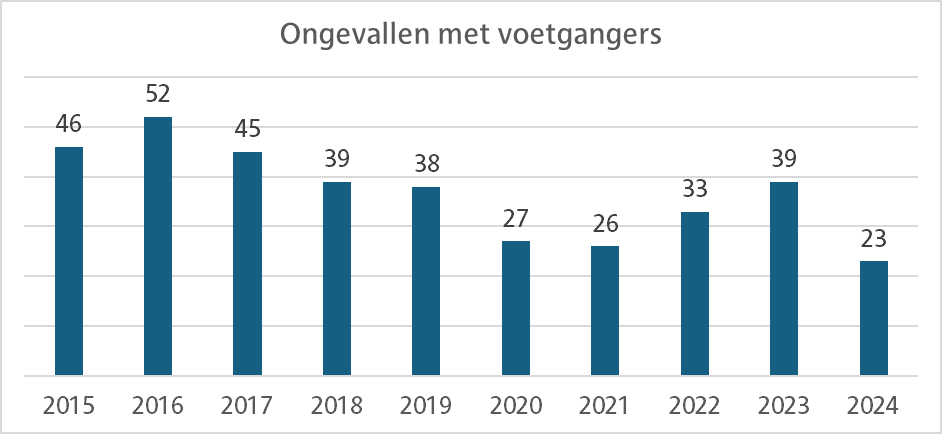 De positieve evolutie is nog een stuk meer uitgesproken in het aantal aanrijdingen met voetgangers. In 2024 waren er 23 ongevallen met een tram waarbij ook een voetganger betrokken was. Tien jaar terug lag dit aantal steevast boven de 40 met een recordaantal van 52 in 2016. Op tien jaar tijd is dit aantal gehalveerd. Ook de aanrijdingen met fietsers en steppers vertoont een dalende trend (van 32 in 2022 naar 26 in 2024) ondanks de toename van dergelijke verplaatsingen.